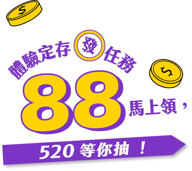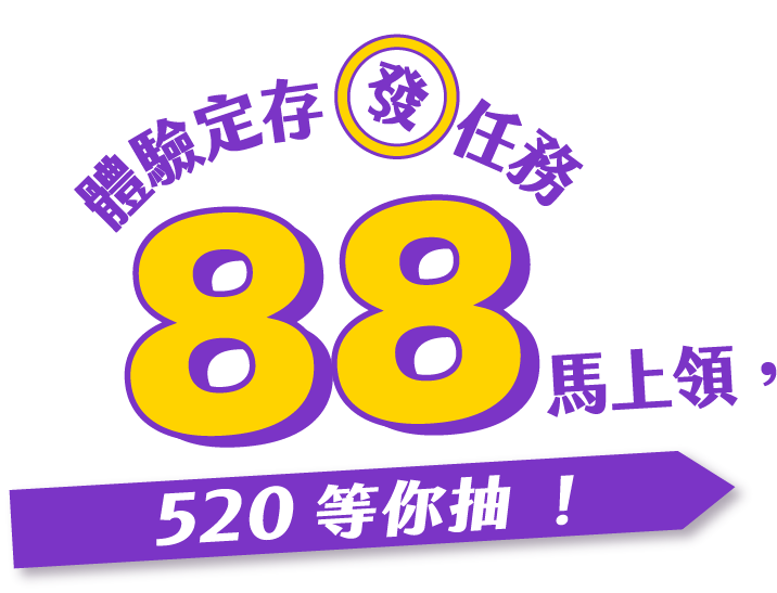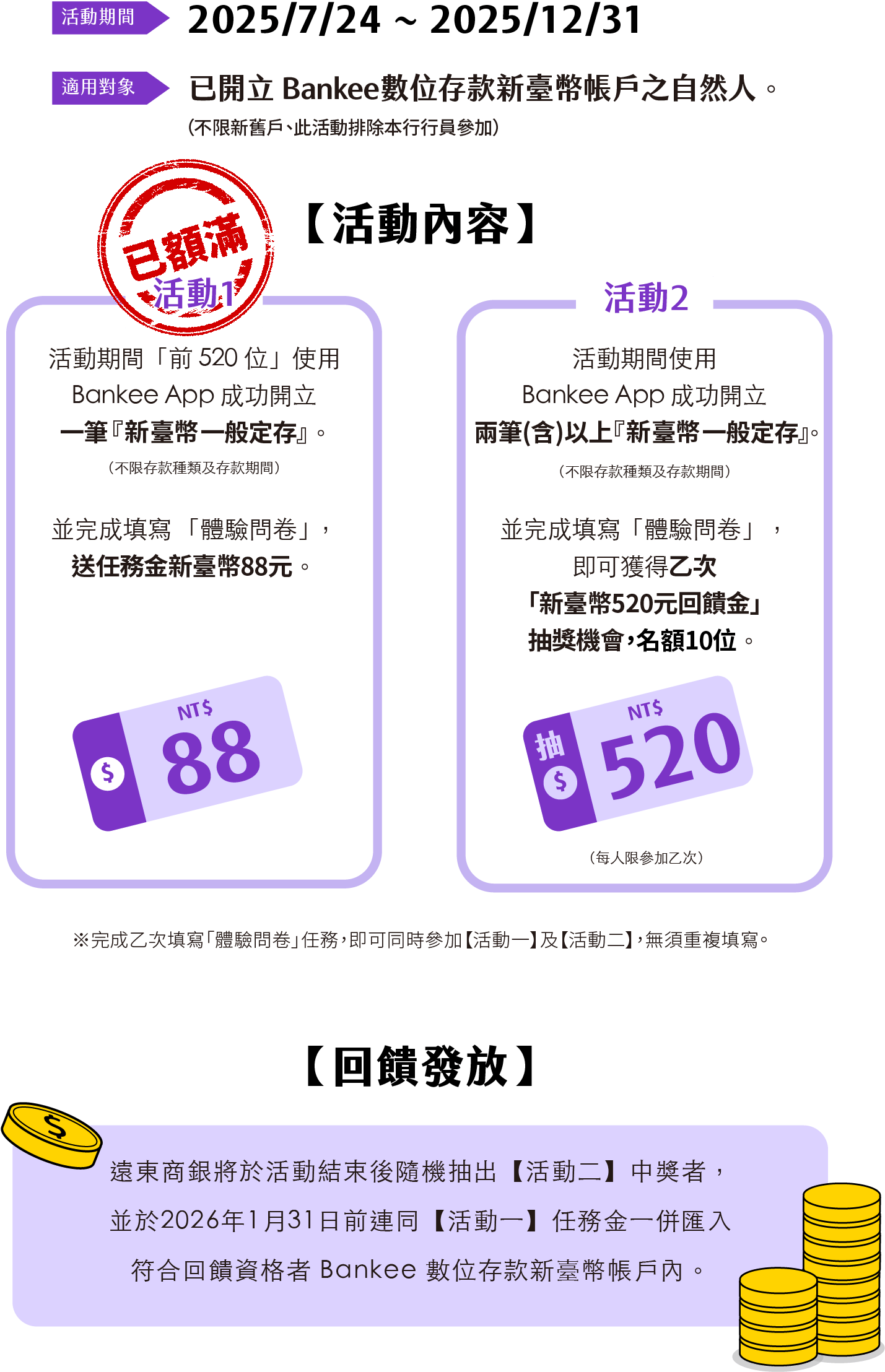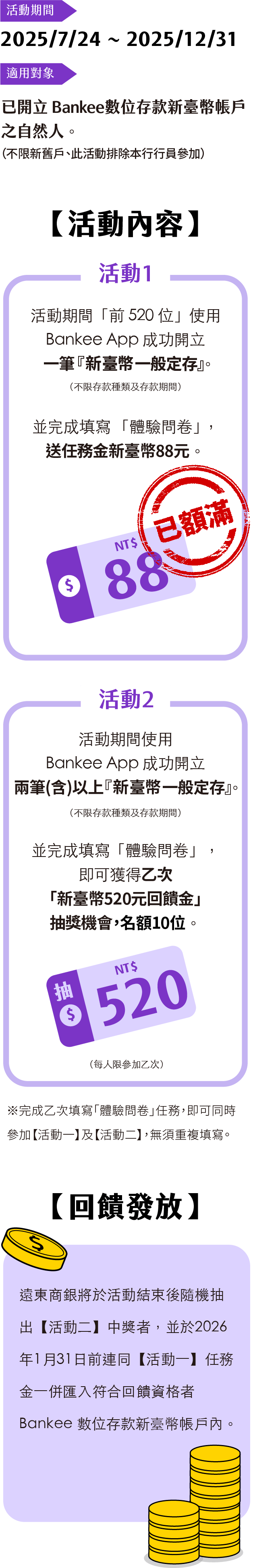 • 活動一:活動期間「前520位」使用 Bankee App 成功開立一筆『新臺幣一般定存』(不限存款種類及存款期間)並完成填寫「體驗問卷」任務,送任務金新臺幣 88 元。(已額滿)