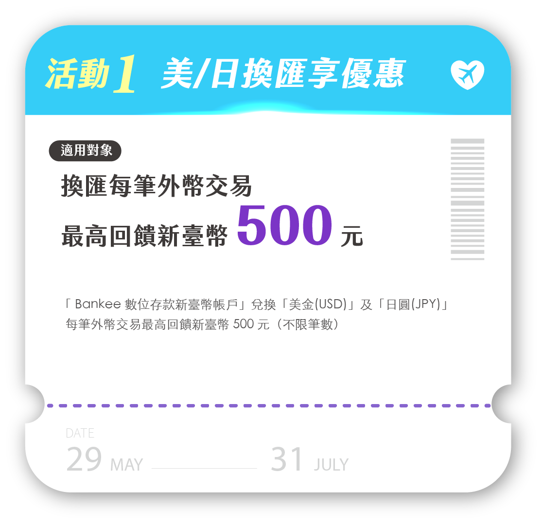 數位存款新臺幣帳戶」兌換「美金 (USD)」或「日圓 (JPY)」滿等值新臺幣 1 萬元者,享新臺幣 15 元回饋金,每筆外幣交易最高回饋新臺幣 500