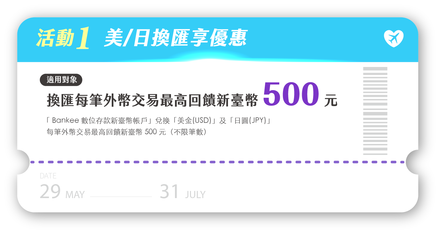 【活動一】遠東商銀 Bankee《美日換匯享回饋,最高單筆賺新臺幣 500 元》活動辦法及注意事項(包含外幣買賣交易須知及風險),請見 Bankee 官方網站活動公告 ;提醒您,上述活動僅限透過 Bankee App 進行外幣(美元/日圓)兌換,兌換前須同時開立 Bankee 數位存款新臺幣及外幣帳戶。