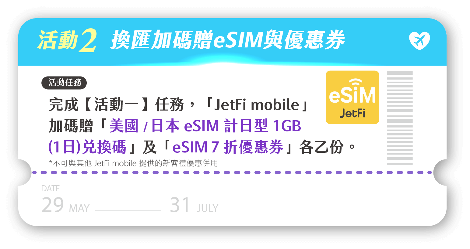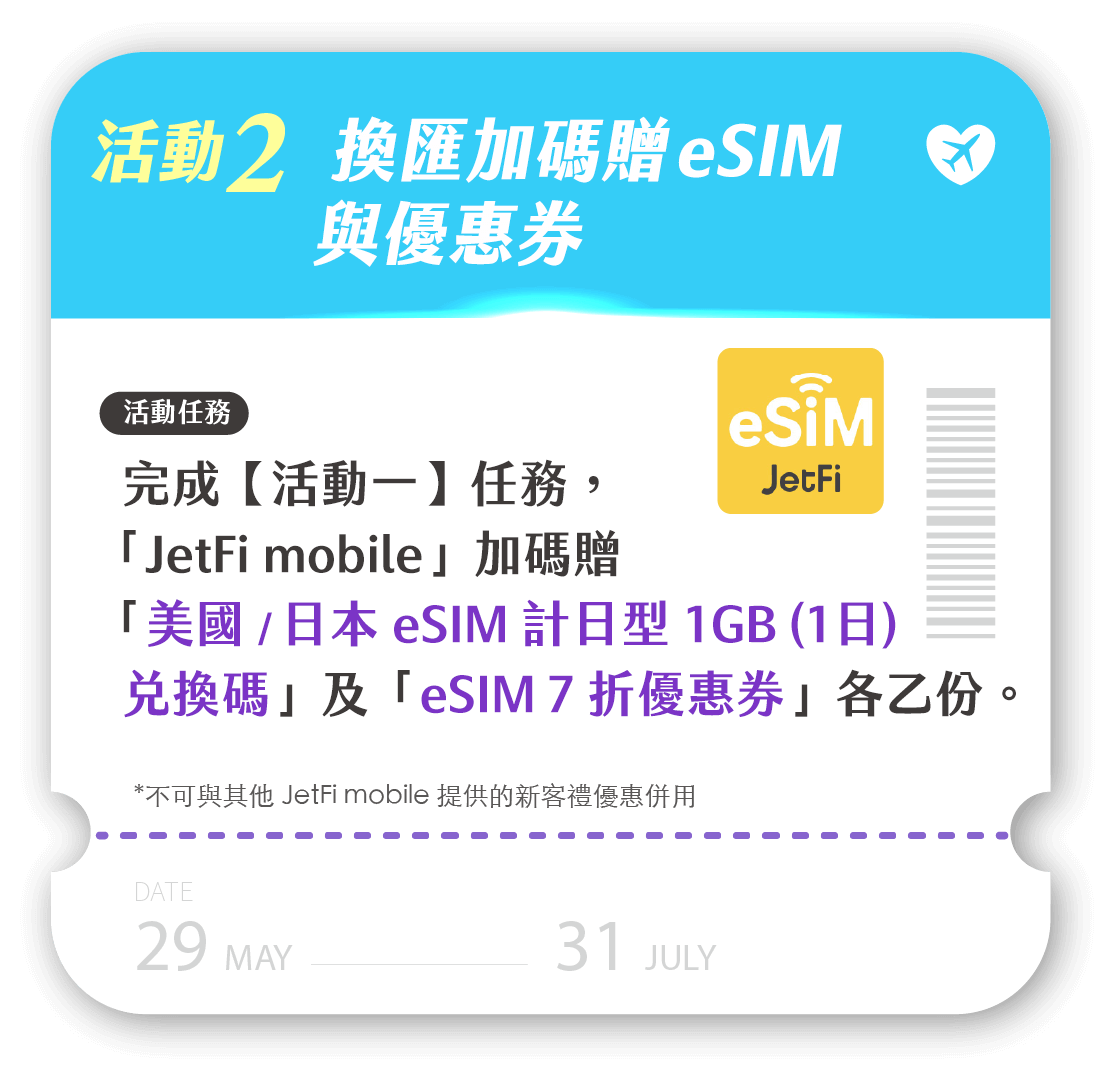 (1) JetFi mobile 新客於活動期間完成【活動一】任務,「JetFi mobile」加碼贈「美國 / 日本 eSIM 計日型 1GB(1日) 兌換碼」及「eSIM