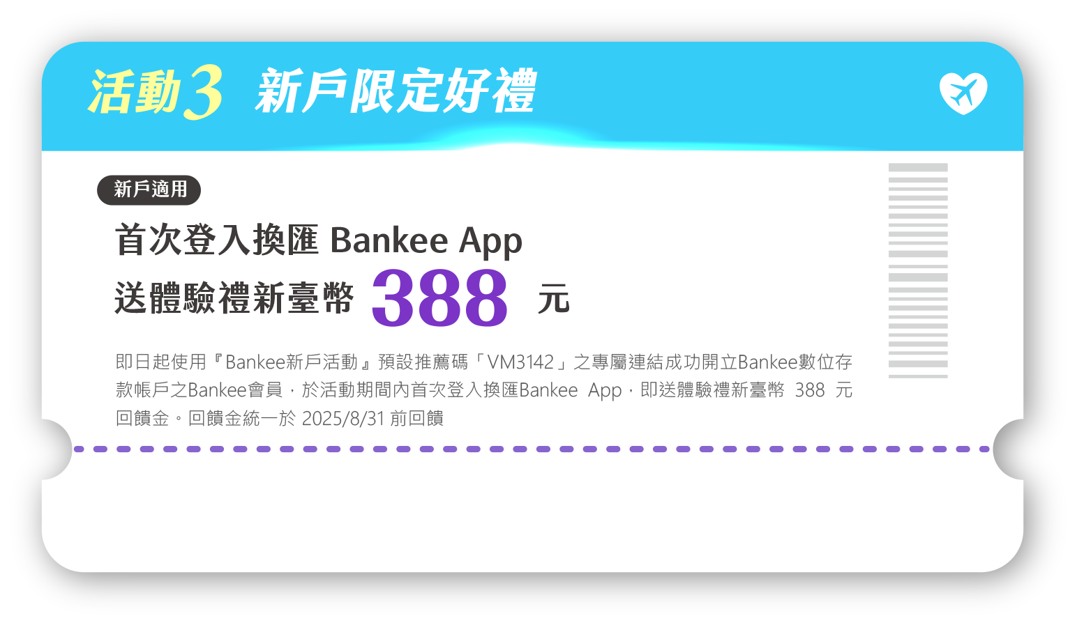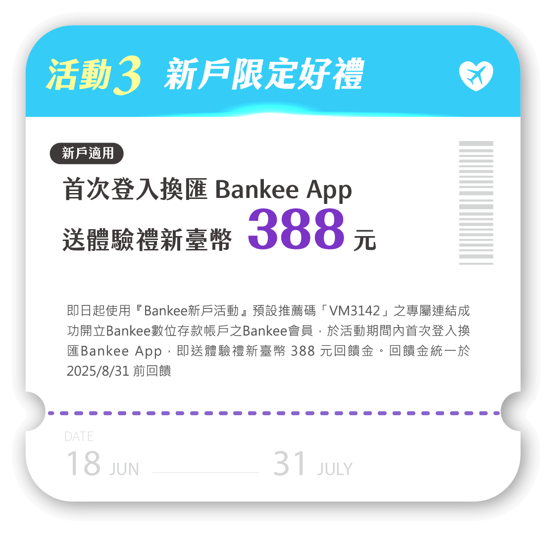 Bankee 會員於 2025/6/18(含)起使用『夏日旅遊方案』活動連結(預設推薦碼「VM3142」)或開戶時輸入推薦碼「VM3142」開立 Bankee 數位存款帳戶者,於活動期間首次登入 Bankee