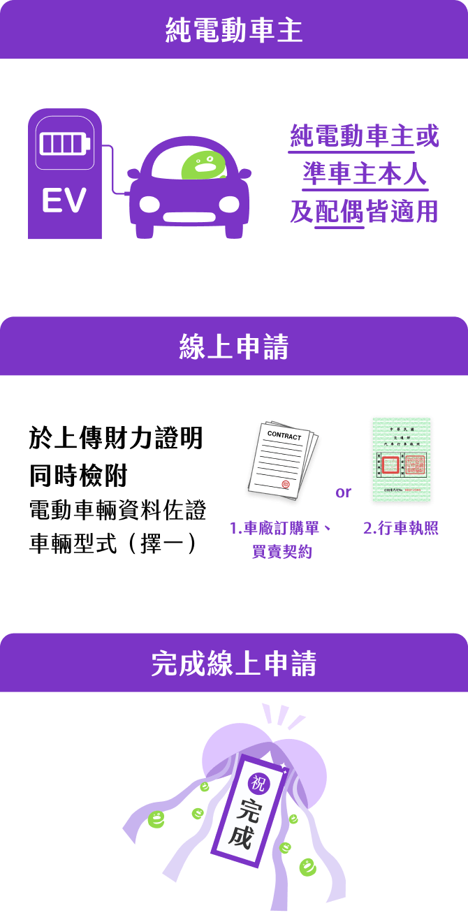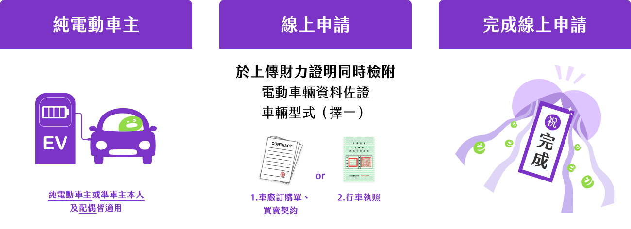 - 檢附國內車廠或國外原廠代理商提供純電動汽車相關訂購文件(如訂購單、買賣契約)或各地監理機關核發行車執照(燃料種類:「電能」),訂購人或車主須為借款人本人或配偶。